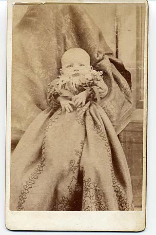 | Charmant nourrisson Little angel! Ce bébé serait lié à la famille Lacasse qui vivait à Saint-Anselme dans le comté de Dorchester. Remarquez sa magnifique robe toute brodée. This baby was probably a member of the Lacasse family who lived in Saint-Anselme. Look at the beautiful dress this infant is wearing.