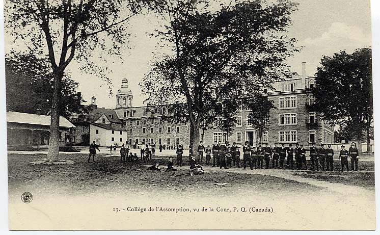 | Collège de LAssomption Playtime in the colleges backyard Fondé en 1832, ce collège dispensait le cours classique ainsi que les cours de lécole dagriculture. Il fut affilié à lUniversité Laval le 22 mars 1880. Ce sont des prêtres du diocèse de Montréal qui en avaient la charge. This college welcomed its first students in 1832. Boys or young men went there to study Latin and Greek, Philosophy, Sciences, and could also attend Agricultural Classes.